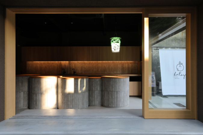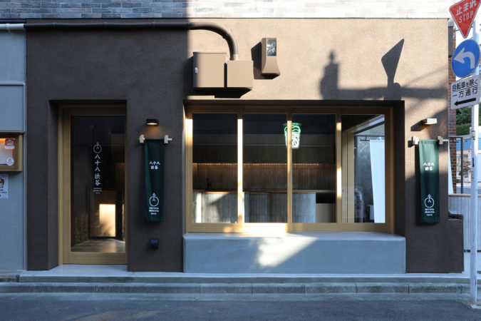 八十八良葉舎 嵐山の渋谷店。 文化的で清々しい奥渋谷の風を店内に惜しみなく通すシームレスデザイン。 じわりと店内から外へにじみ出るような流れを作る。 空間の主役はお点前カウンター。 円柱型カウンターを複数立て、一柱一人、作業スペースを確保しながら 「茶を点てる姿を格好良く。思わず写真に収めたくなるように」 既存店のデザインブランディングを引き継いでいる。